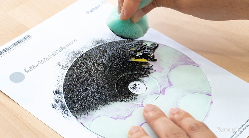4 การลงสีพื้นหลัง ให้รอสีที่เราเพ้นท์ไว้แห้งสนิทก่อน จากนั้นพลิกอีกด้านของแผ่นซีดีขึ้นมา นำสีที่ต้องการใช้เป็นสีพื้นหลังมาระบายลงบนบริเวณที่เราเว้นไว้ หากอยากลงสีให้เร็วขึ้น พี่ออยแนะนำให้ใช้แปรงใหญ่ ๆ หรือฟองน้ำในการลงสี โดยใช้วิธีเดียวกับที่พี่ออยทำในบทความ ภาพพิมพ์ฟองน้ำ ก็จะได้พื้นผิวที่สวยไปอีกแบบนะคะ