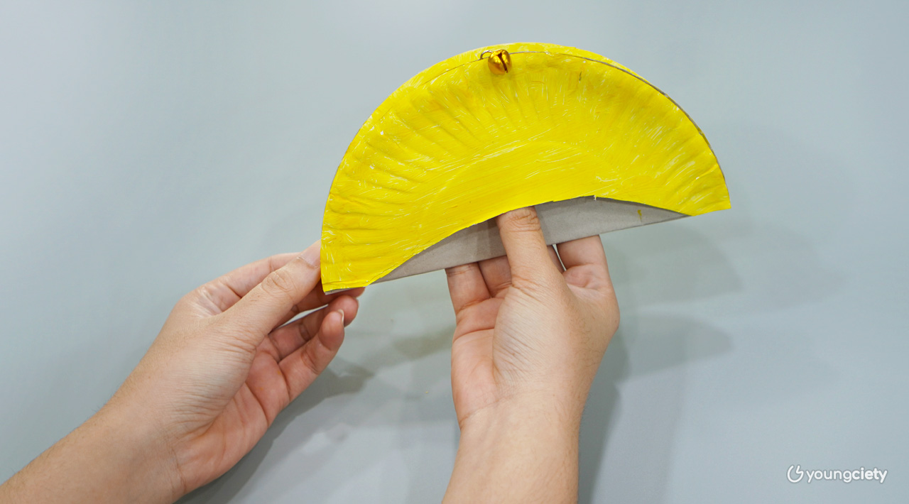 4. เมื่อจานกระดาษแห้งแล้ว ให้นำจานกระดาษที่ระบายด้วยสีเหลือง และแดง มาพับเป็นครึ่งวงกลม โดยพับส่วนที่เป็นสีไว้ด้านใน