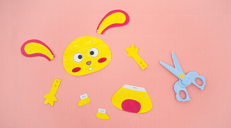 6. นำชิ้นส่วนที่เราจะขยับ อย่างเช่น หูและแขน มาติดด้วยหมุดทองเหลือง ตรงรูวงกลมที่เราเจาะเตรียมเอาไว้ โดยใส่หมุดทองเหลืองที่ช่องวงกลมอันที่ 2 นะคะ เพราะรูวงกลมอันแรกเราจะเว้นไว้สำหรับร้อยไหมพรม (ถ้าขาหมุดทองเหลืองที่เราซื้อมายาวเกินไป ให้ใช้คีมตัดเหล็กตัดออกหรือจะใช้วิธีพับขาหมุดทั้ง 2 ให้สั้นขึ้นก็ได้ค่ะ)