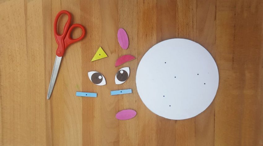 2. เมื่อกาวแห้งให้ตัดชิ้นส่วนต่าง ๆ ออกมาเป็นชิ้น ๆ ตามภาพ บนวงกลมที่เป็นส่วนหน้าผู้ปกครองควรใช้ปากกาจุดทำสัญลักษณ์ไว้เวลาเจาะรูจะได้ไม่เบี้ยว