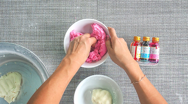 3. เมื่อได้เนื้อแป้งตามที่ต้องการแล้ว ให้แบ่งแป้งออกเป็นส่วน ๆ จากนั้นใช้นิ้วจิ้มแป้งให้เป็นหลุม (เวลาเทสีจะได้ไม่เลอะค่ะ) แล้วเทสีผสมอาหารลงไป จากนั้นนวดแป้งกับสีผสมอาหารให้เนียนจนเป็นเนื้อเดียวกันค่ะ หากอยากได้แป้งหลาย ๆ สี แนะนำให้ผสมสีที่ละก้อนนะค่ะ เพราะไม่งั้นสีอาจปนกันได้ แต่ถ้าใครไม่อยากใส่สีสามารถข้ามขั้นตอนนี้ไปได้เลยค่ะ